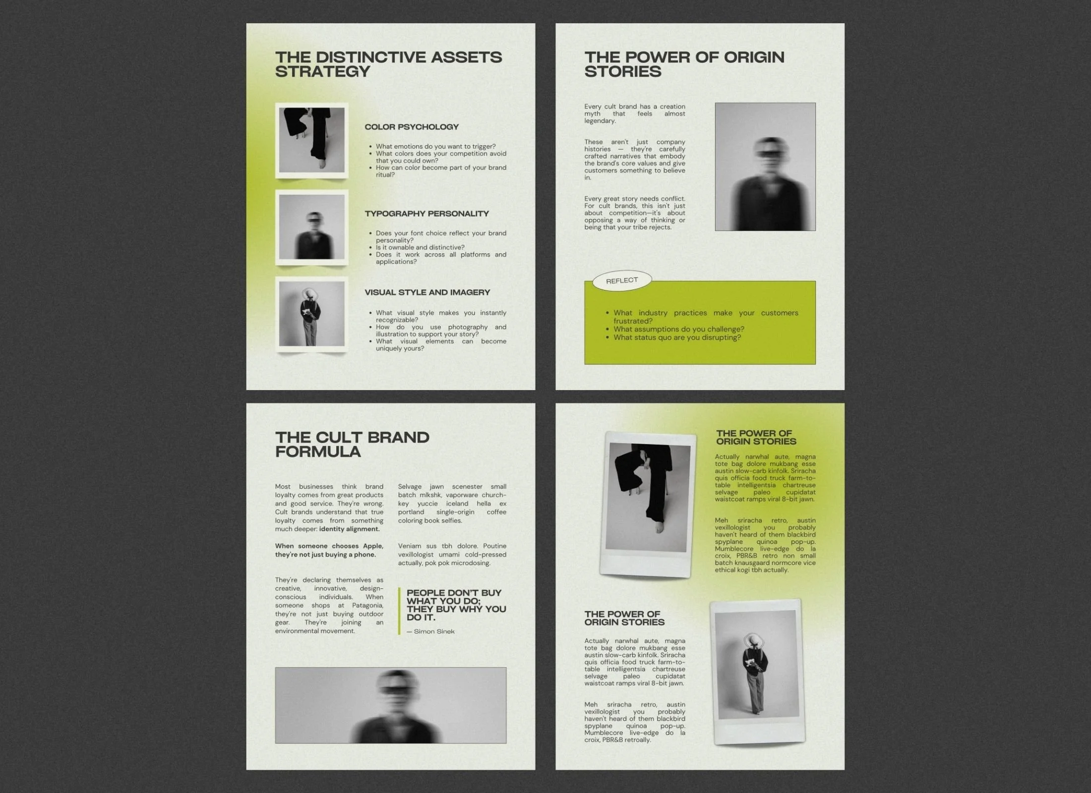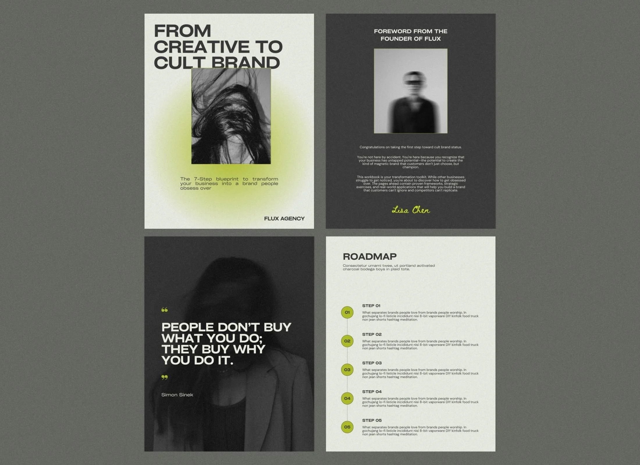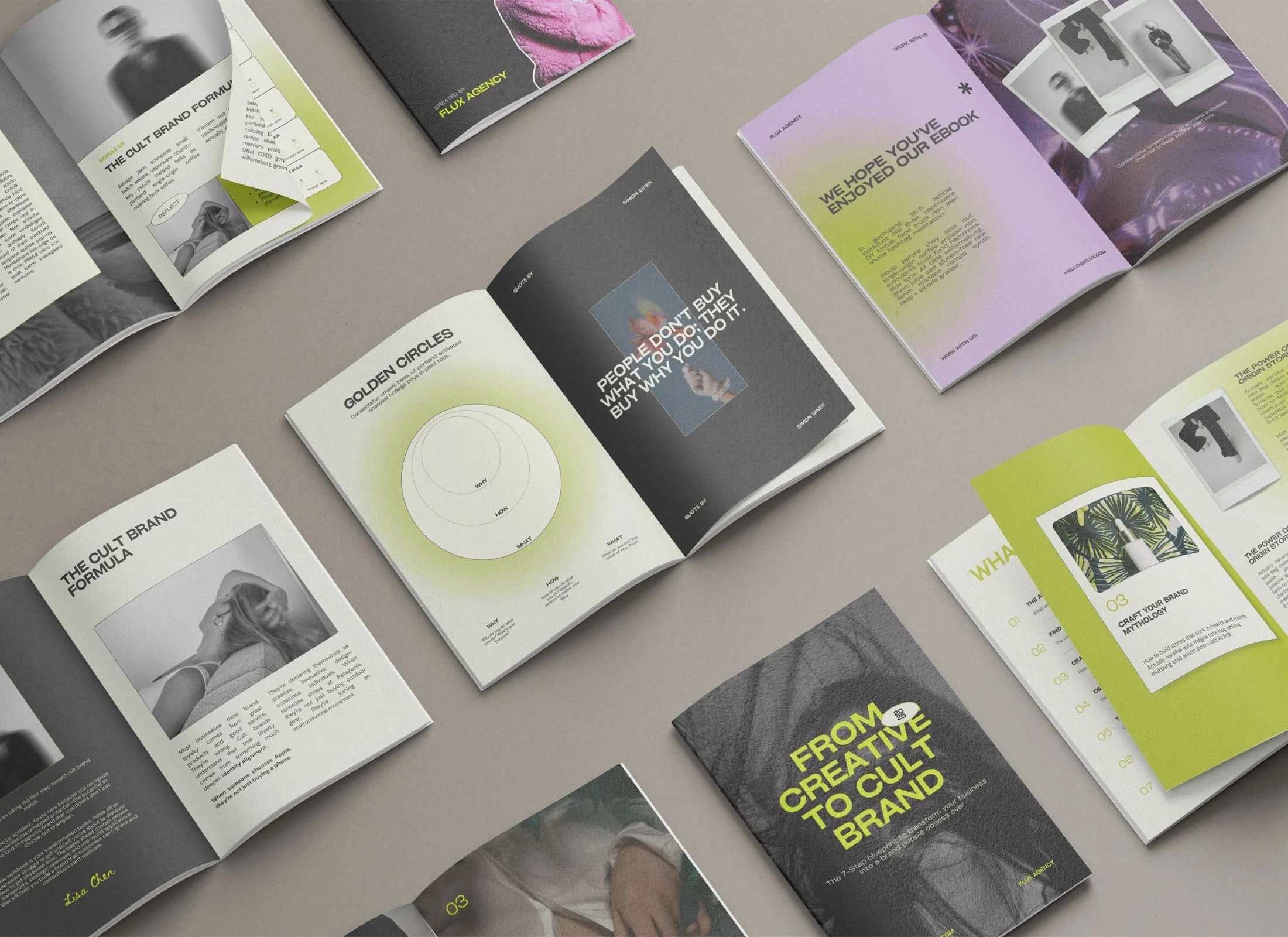 Editorial covers, chapter dividers, content layouts, visual diagrams, and CTA pages that move readers through your methodology.