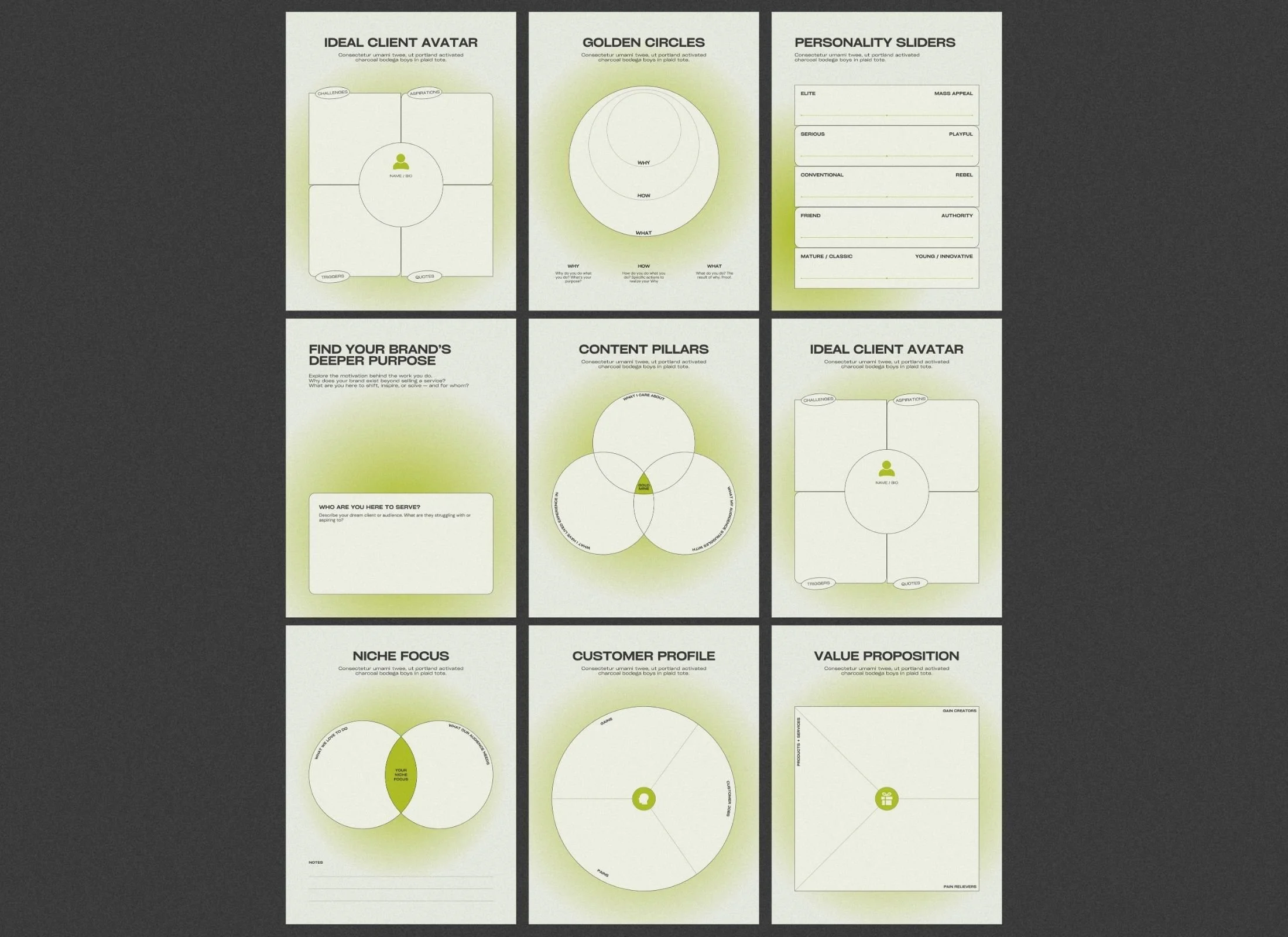 This template works across US Letter and A4 formats with cover designs, assessment tools, and interactive workbook pages. The lime green and lilac color scheme delivers editorial impact for digital downloads, client onboarding guides, or course materials.