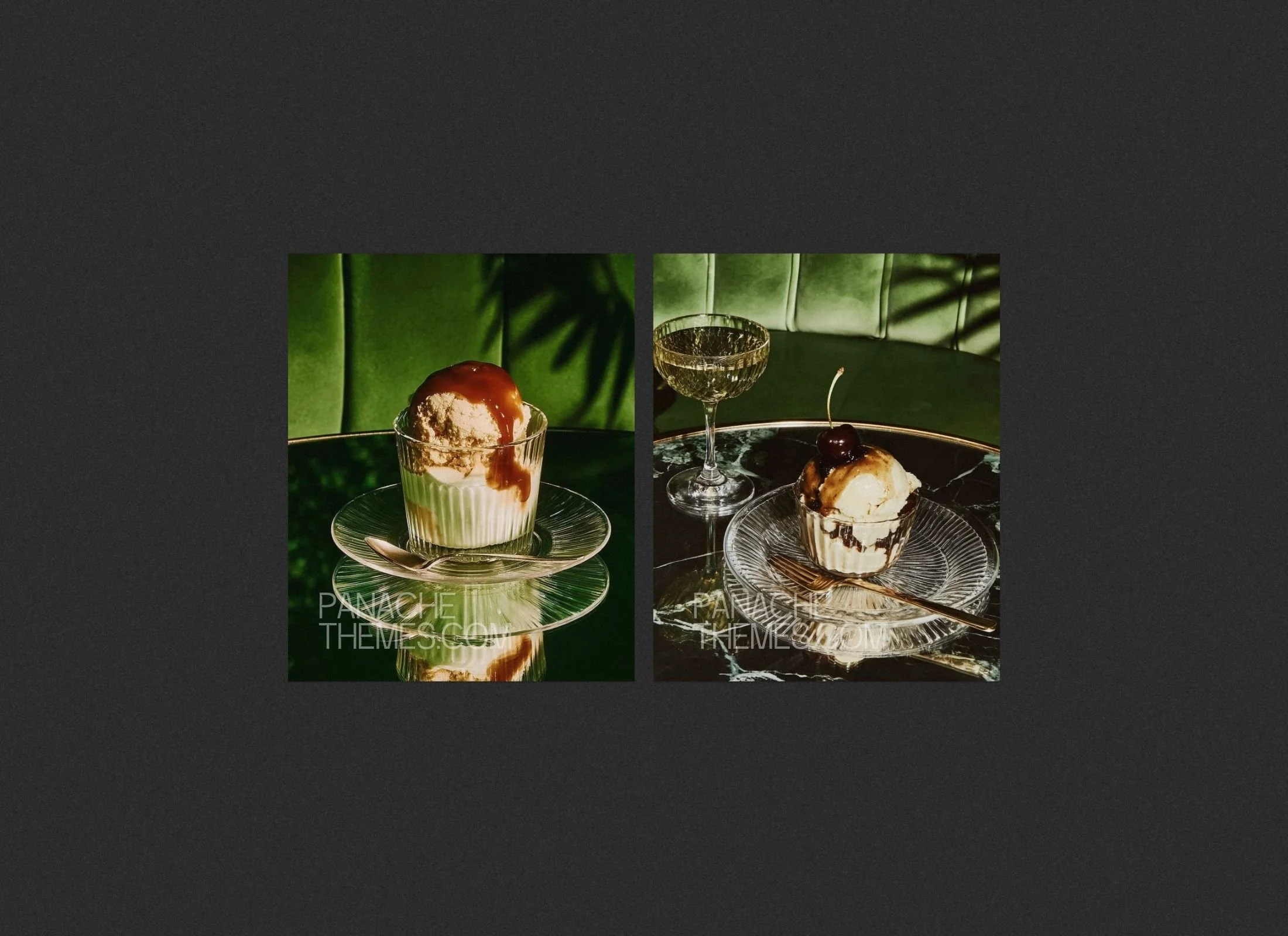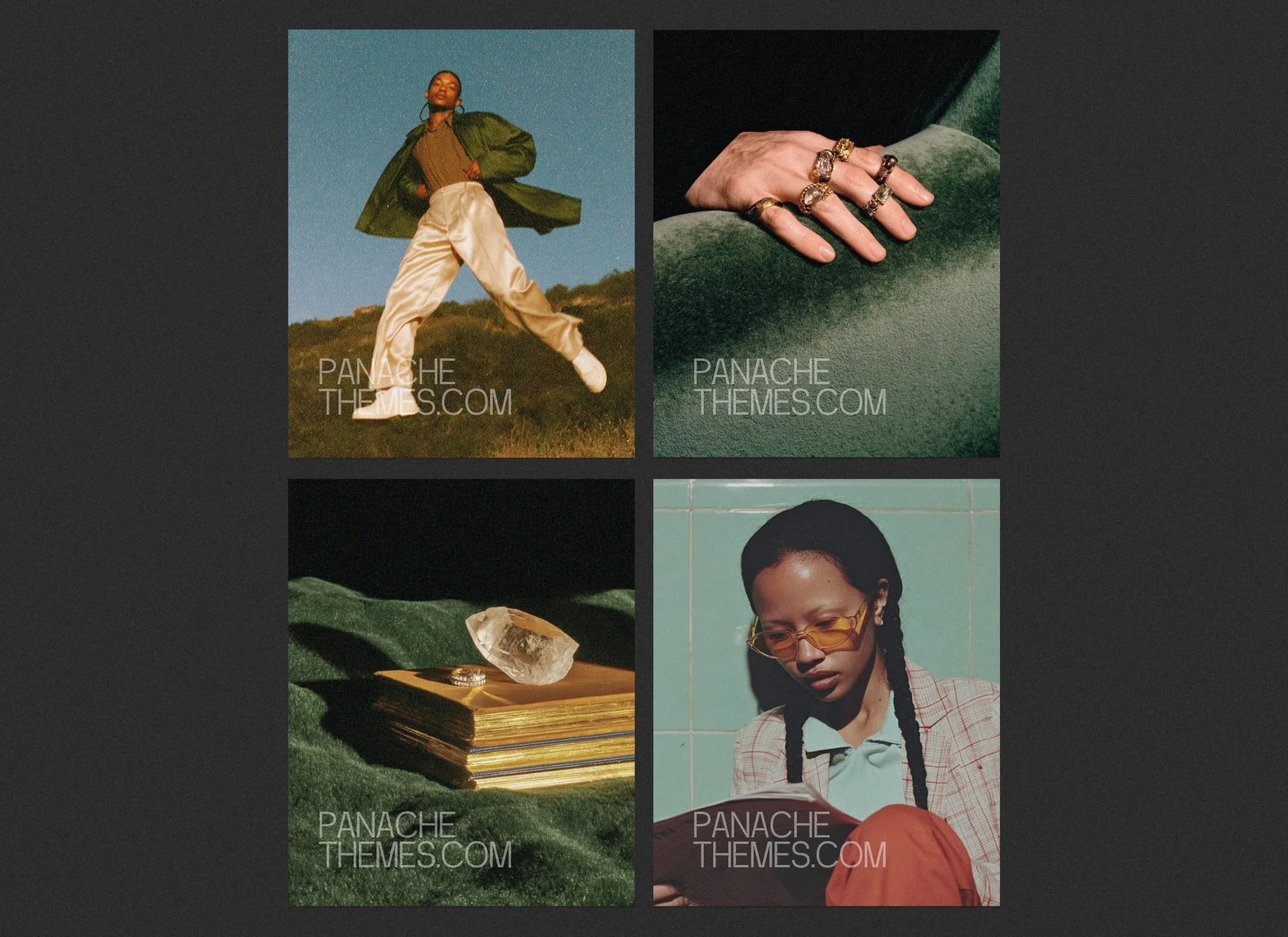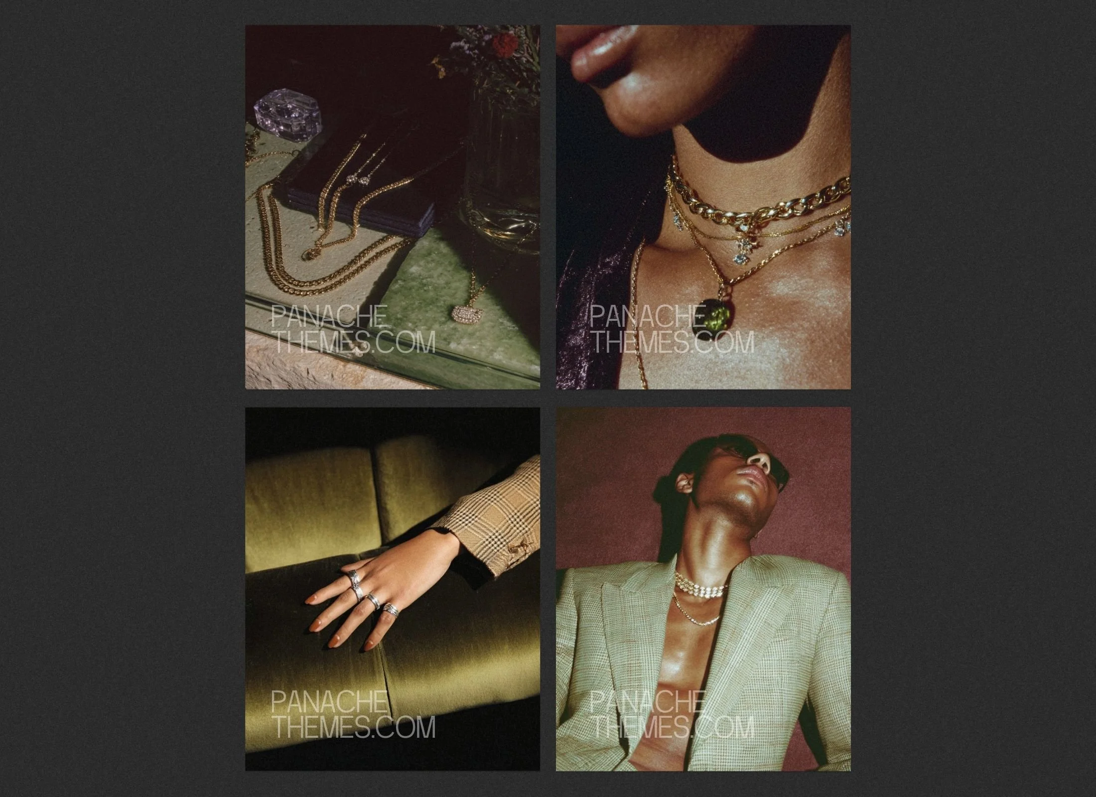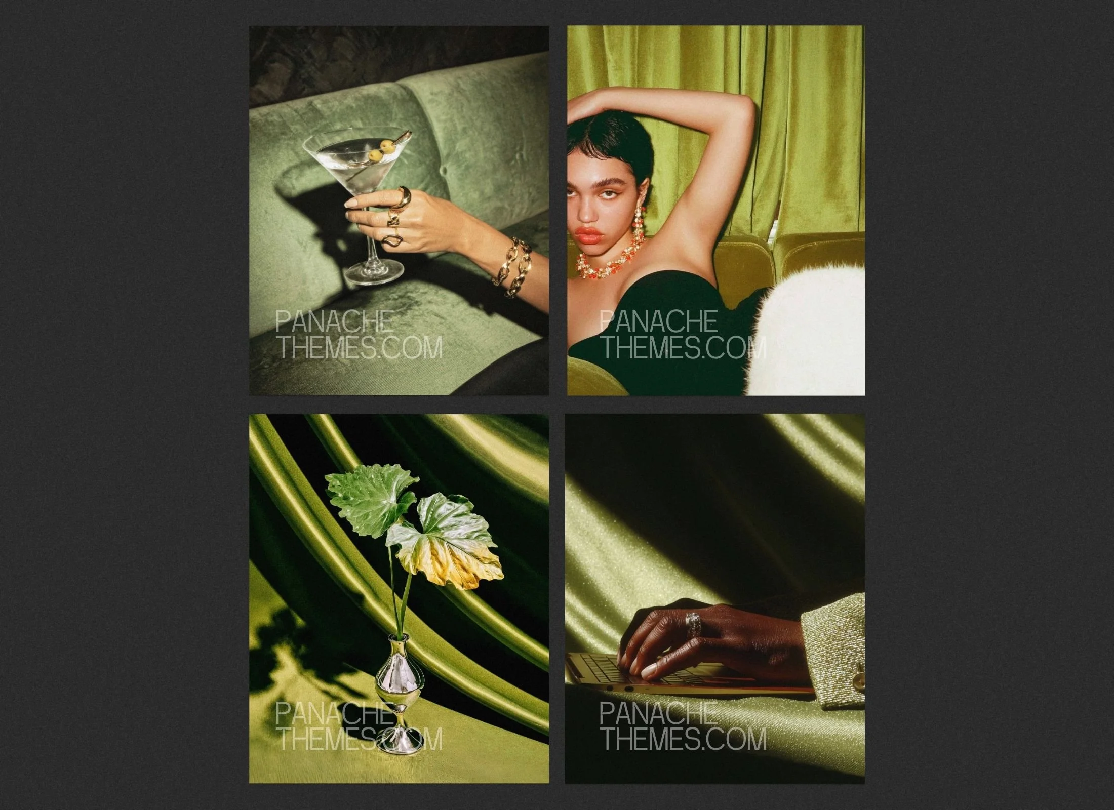 Features plush velvet textures and sophisticated lifestyle shots in warm green and gold tones.